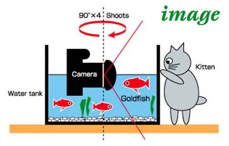 さて今回からこのカテゴリでパノラマVRの制作記を連載してみよう。上の写真(素材集より)を見て《水槽の中の金魚を見つめている猫》というイメージに決まった。更に水槽の中からのカメラ視点で撮影しようと企てた。水槽は20から30cm角程度の小さいものが理想だ。撮影イメージは下図のようになる。