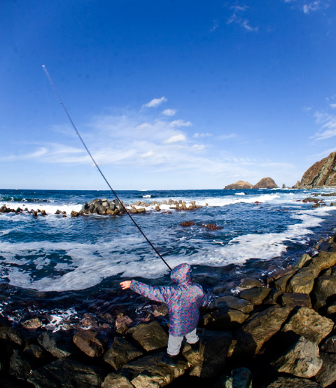 佐渡島らしいパノラマを。佐渡の北端に近い「願(ねがい)」集落に立ち寄った際、釣りをしている方がいた。釣り人に近寄ってみると、すぐそこで民宿を営むおばさん。彼女曰く、 「辺りに寄って来るノラ猫の餌にタナゴを釣ってるのよ」。…なんとも豪快なことだ。