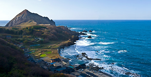 前回の猫の餌釣りをするおばちゃんの後方に見えるのが願(ねがい)大橋。この橋から見下ろす「願」集落は写真愛好家のおきまりスポット(写真下)。パノラマは橋の下を通る旧道に下りてポール撮影してみた。